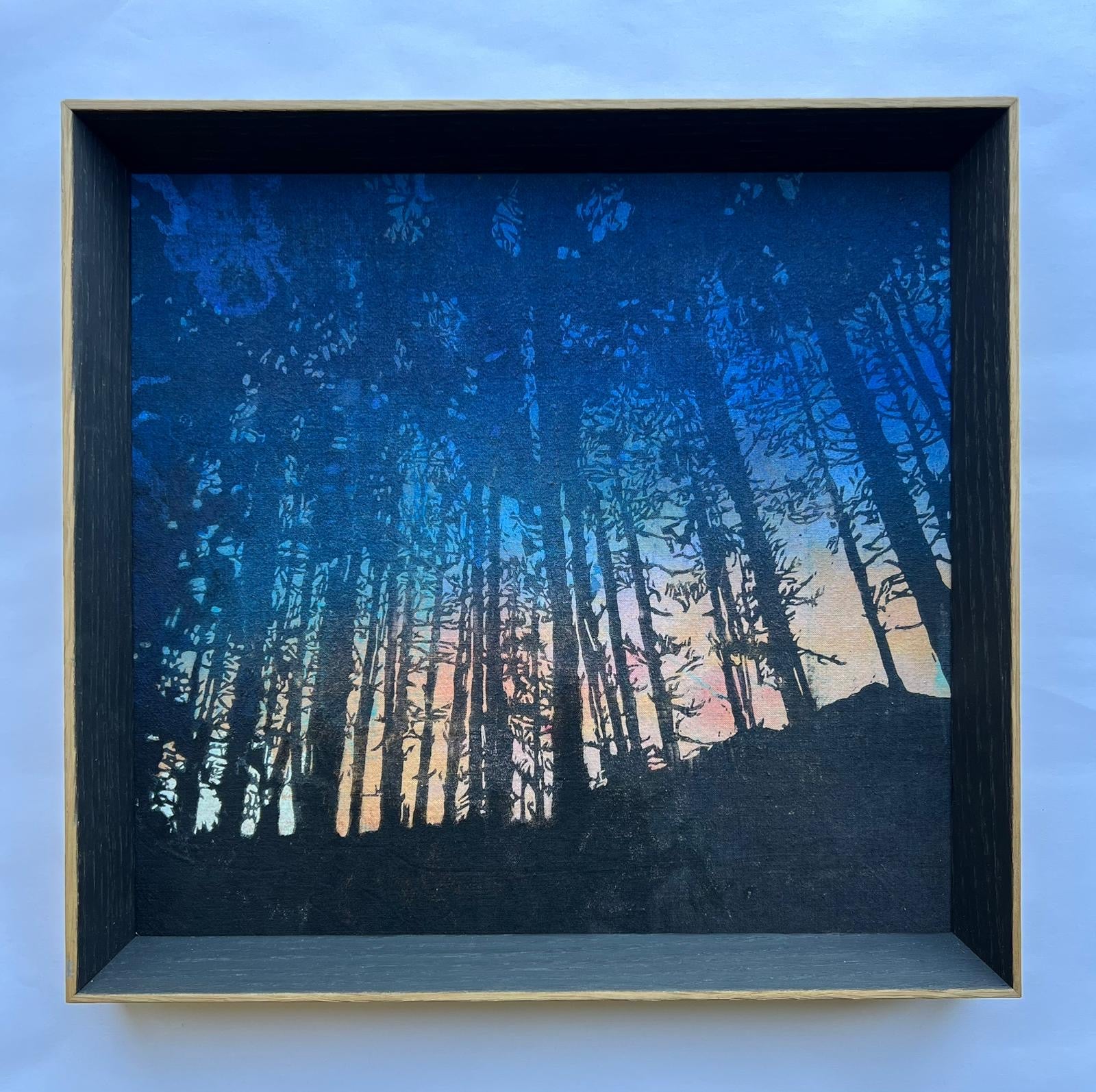 This piece is offered framed, oak frame - painted black interior with oak edge
