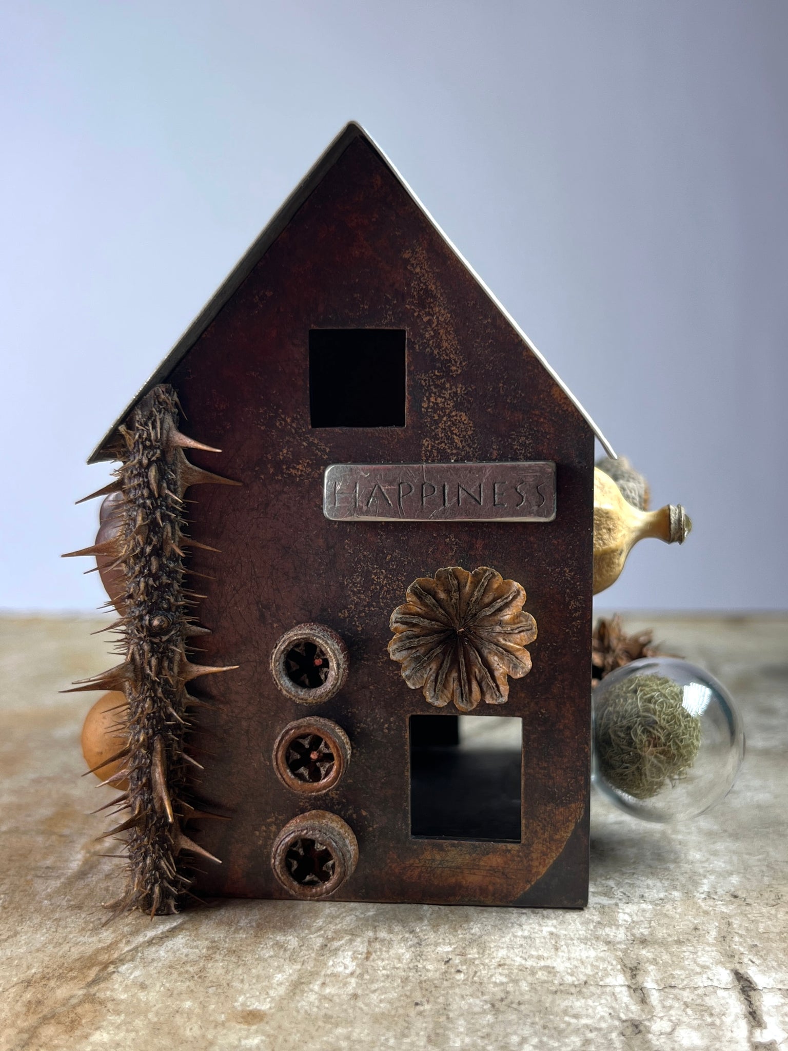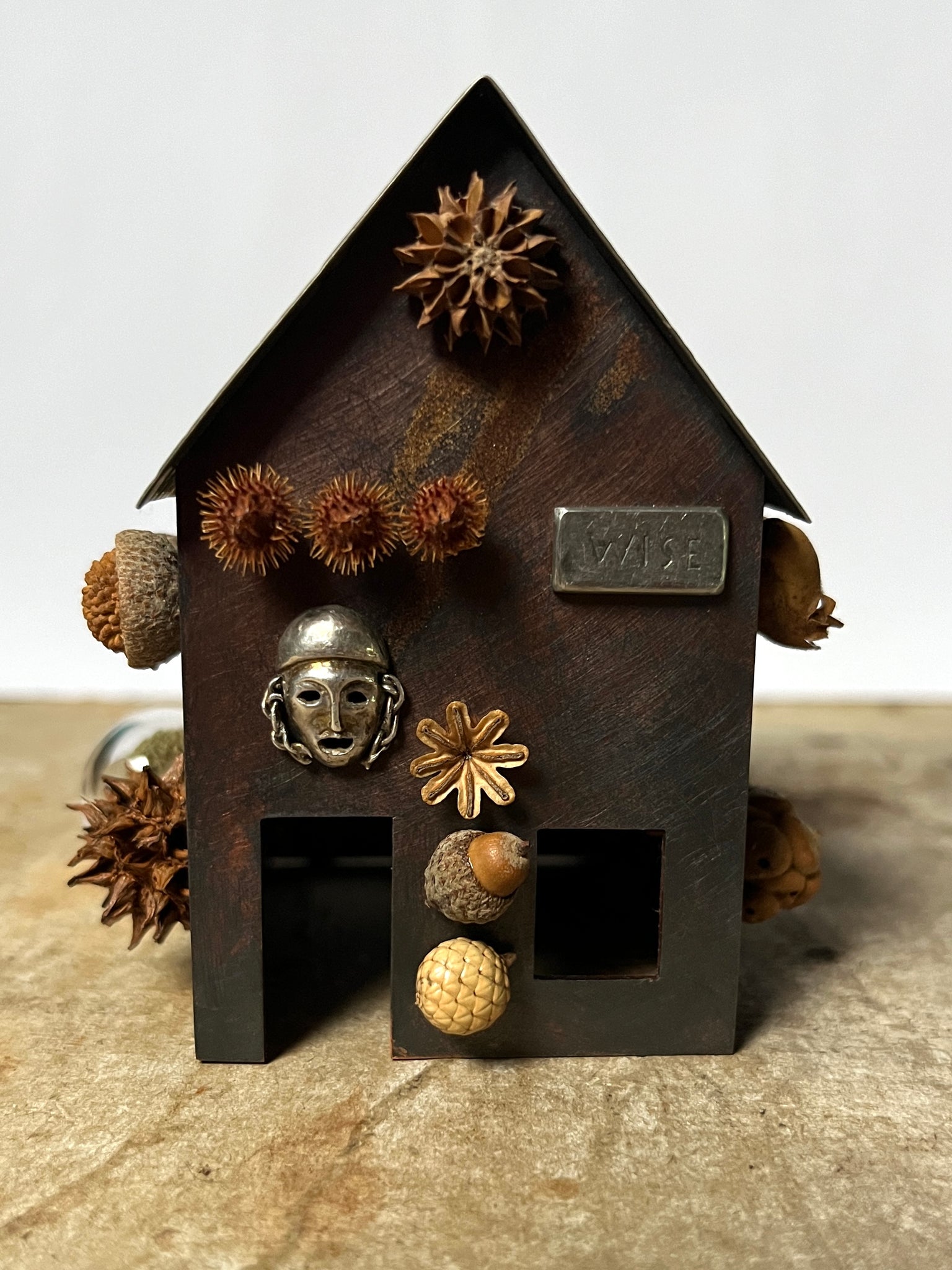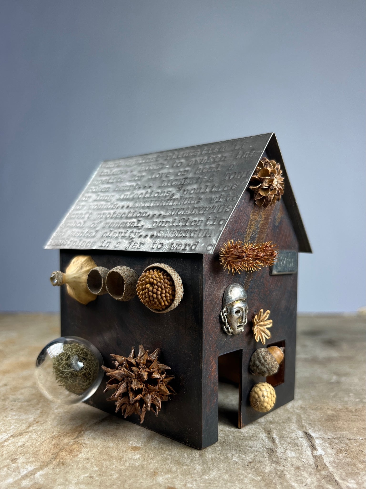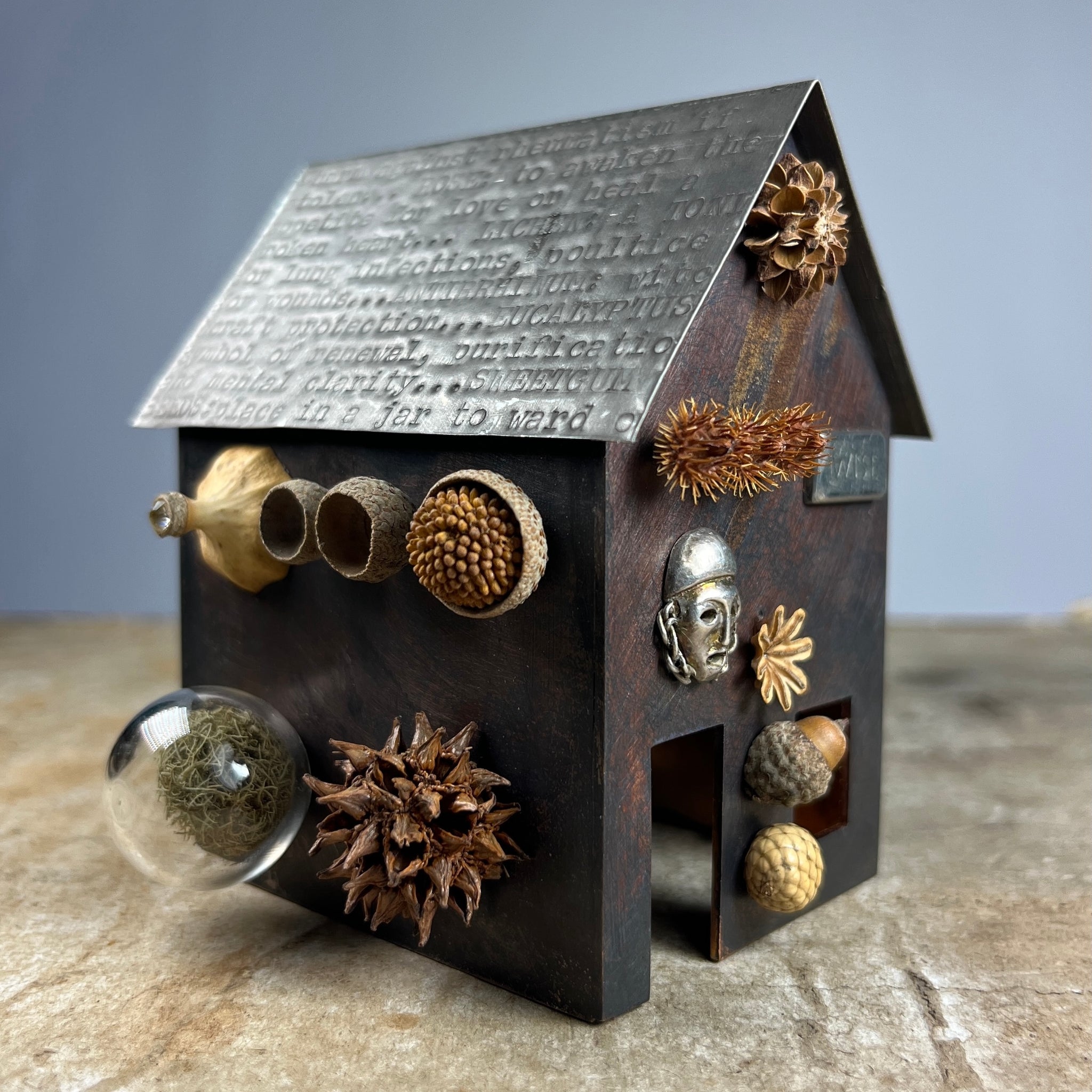 Materials: Patinated copper, pewter, silver, natural materials, glass, wood.