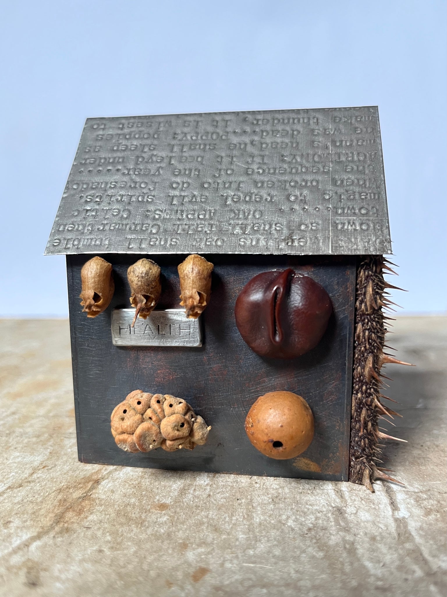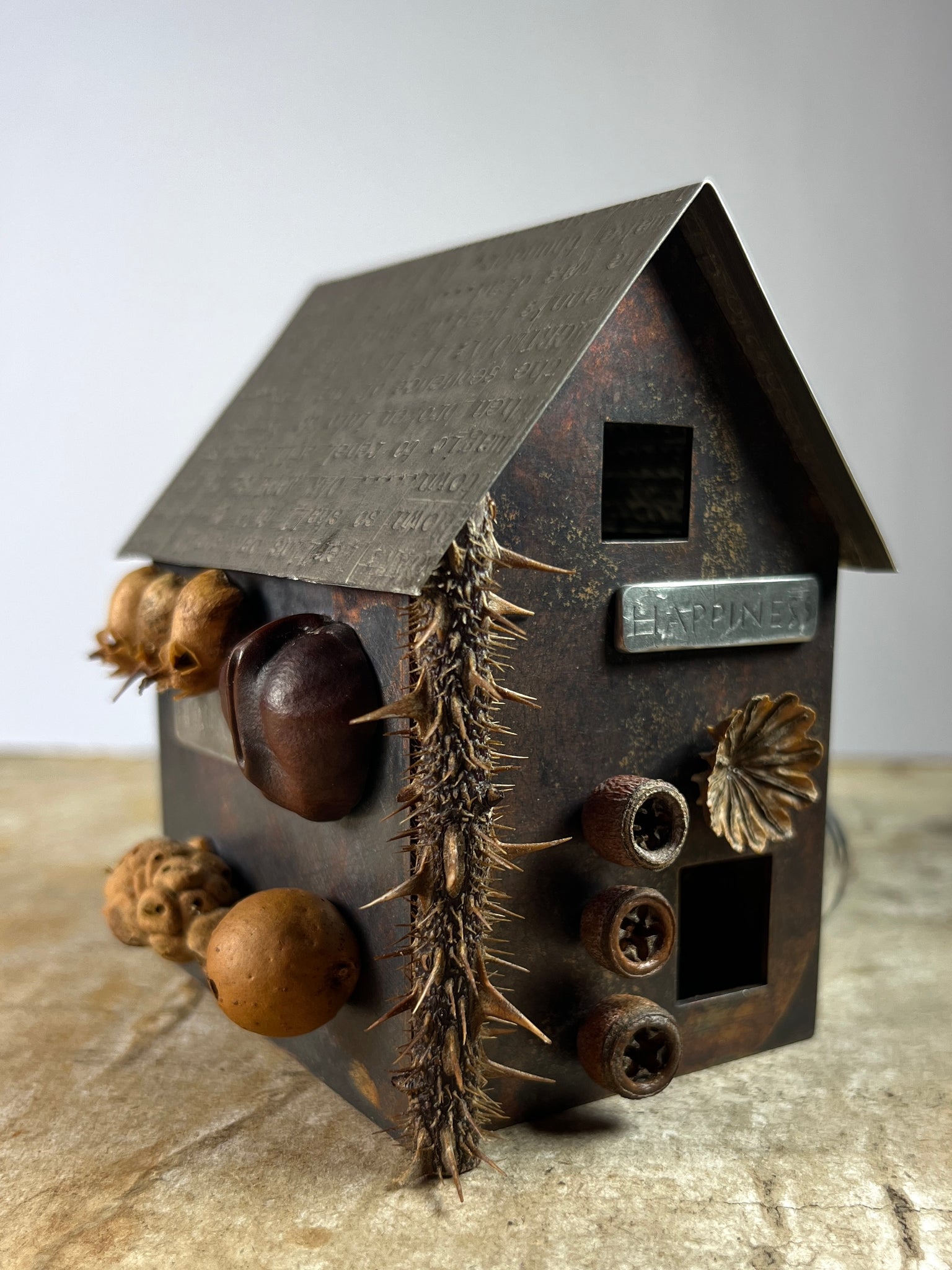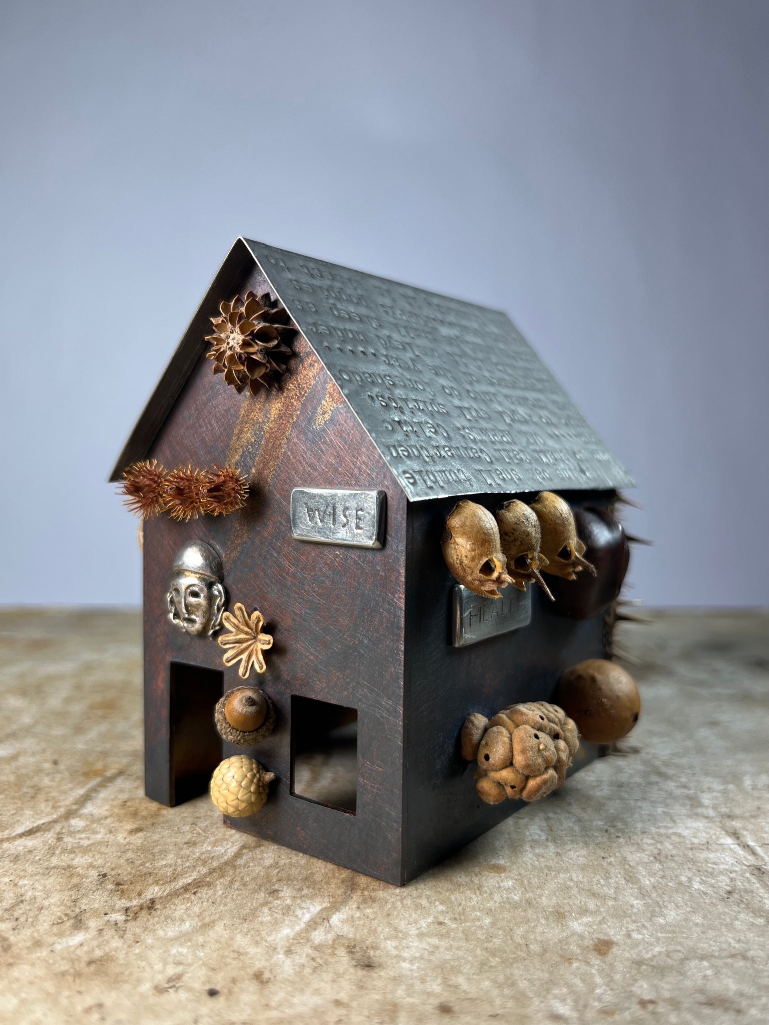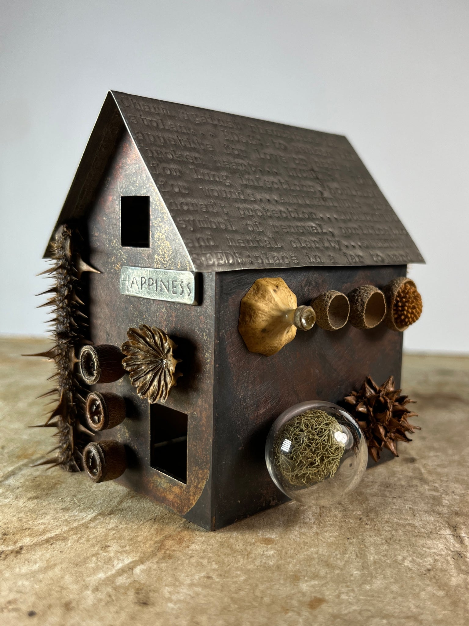 Materials: Patinated copper, pewter, silver, natural materials, glass, wood.