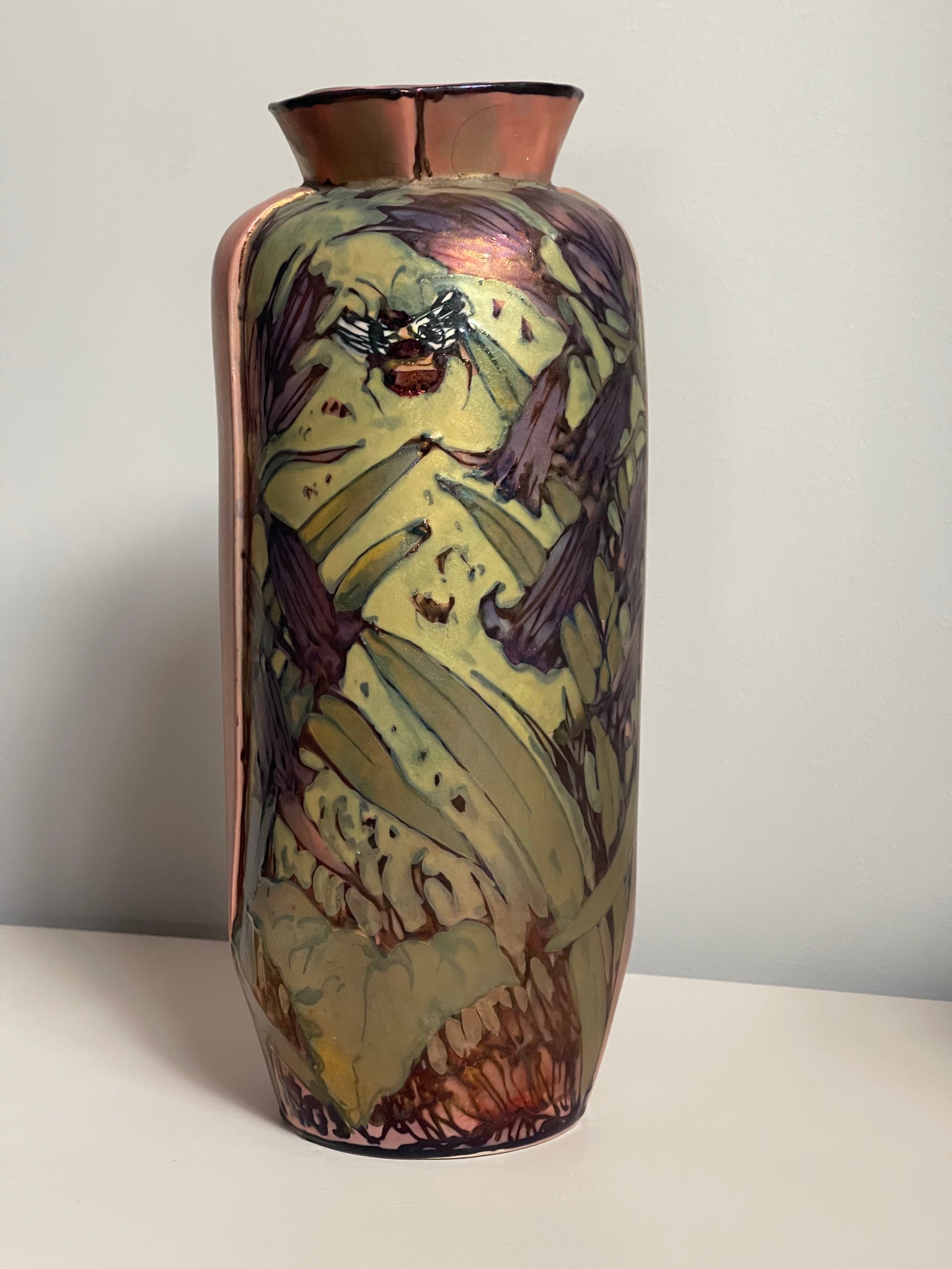 Tubelined with a fine outline of slip, painted with underglaze colours and decorated with metallic lustres. This piece is then fired in a special reduction firing which reveals the lustrous effects.