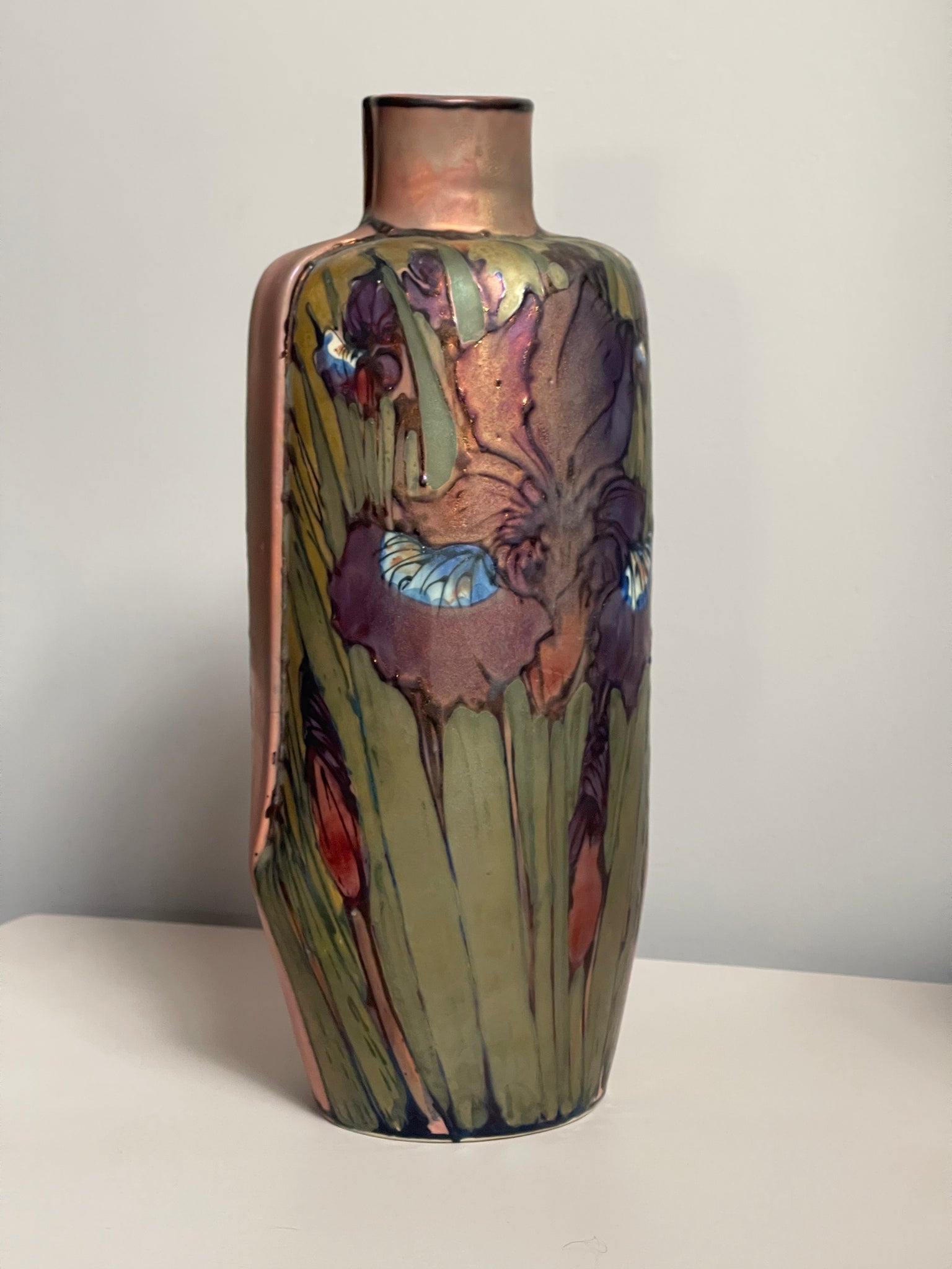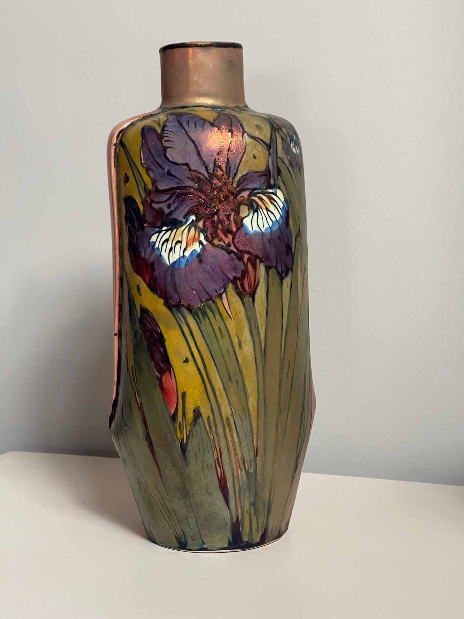 Tubelined with a fine outline of slip, painted with underglaze colours and decorated with metallic lustres. This piece is then fired in a special reduction firing which reveals the lustrous effects.