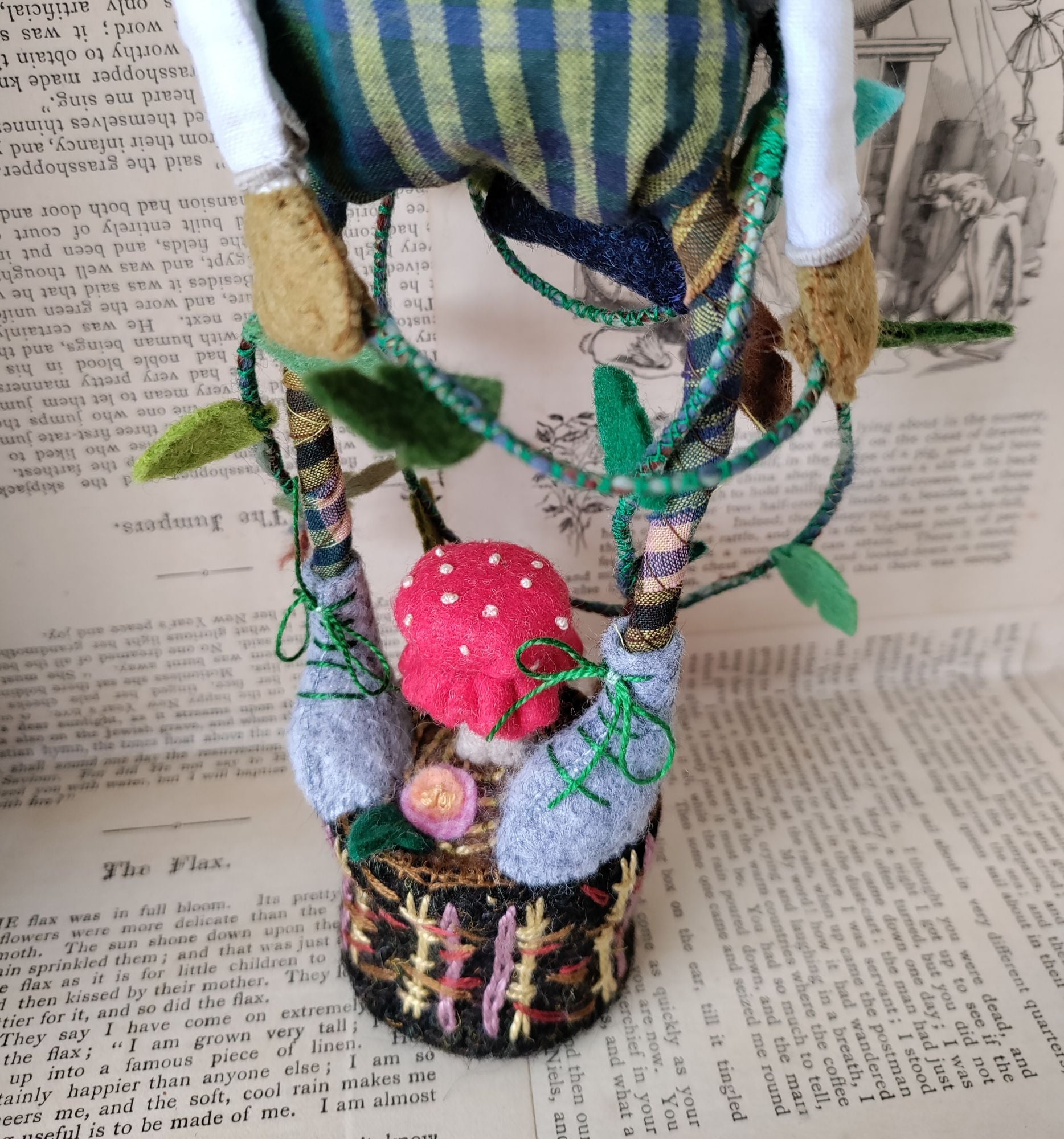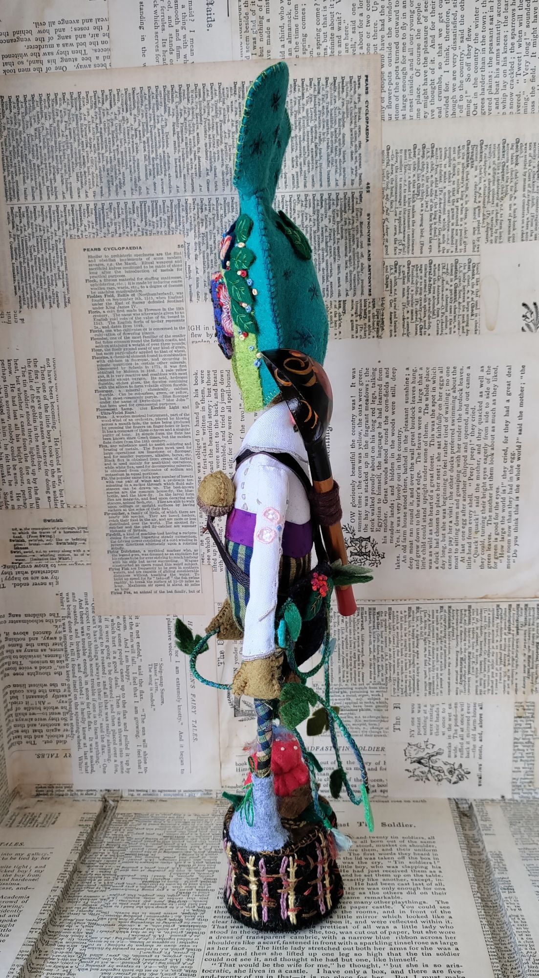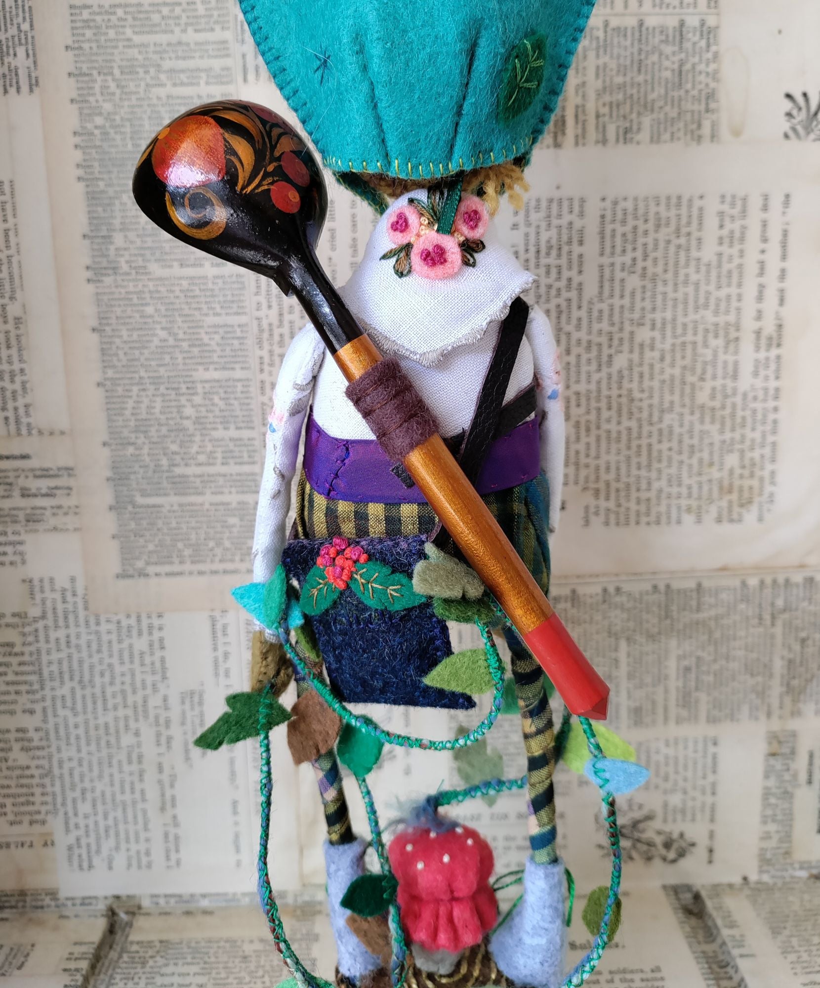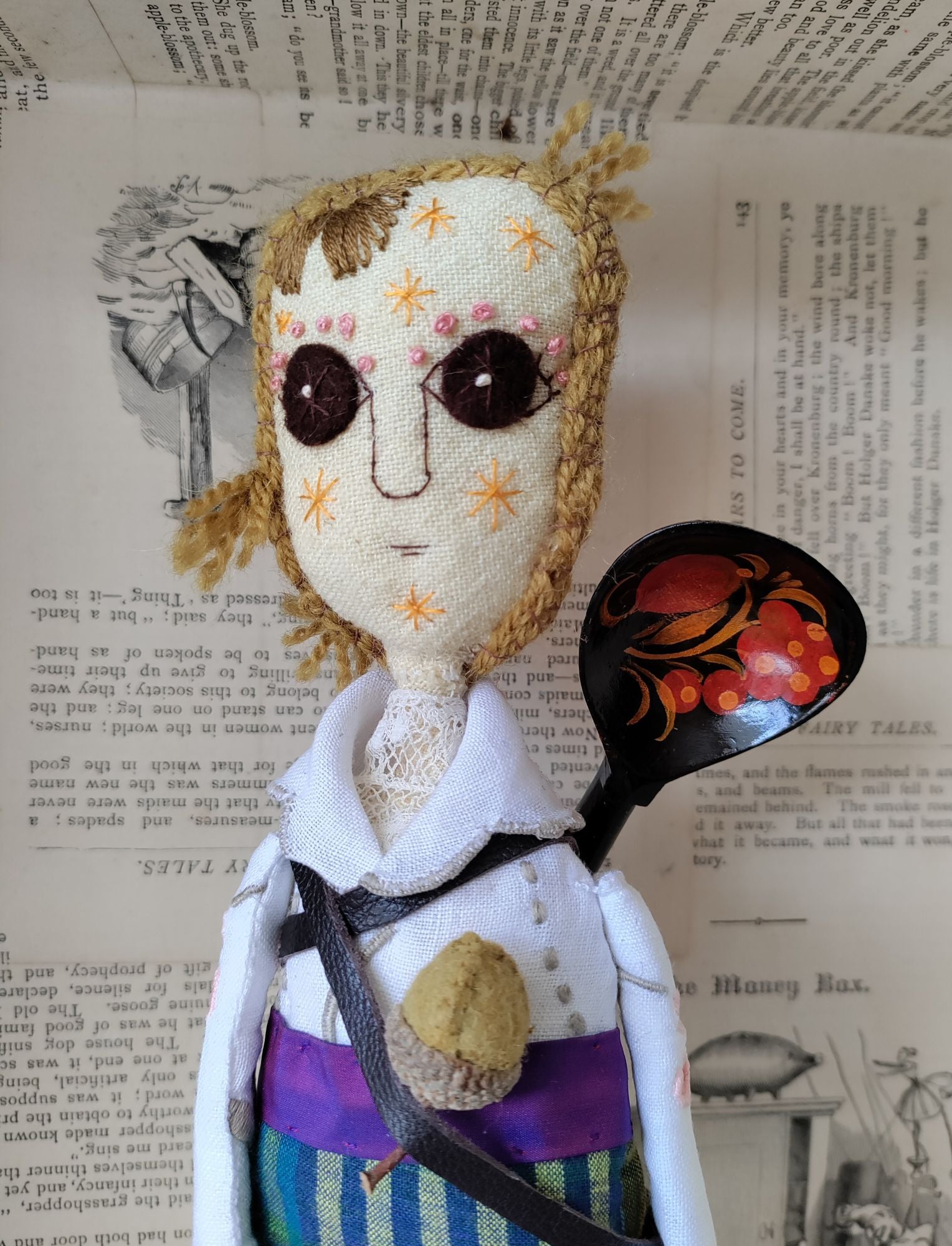 Mixed materials and found objects (cotton fabric, vintage linens, wool, wool-mix felt, wire, wooden cotton reel, acorn shell top, painted wooden spoon). Handstitched
