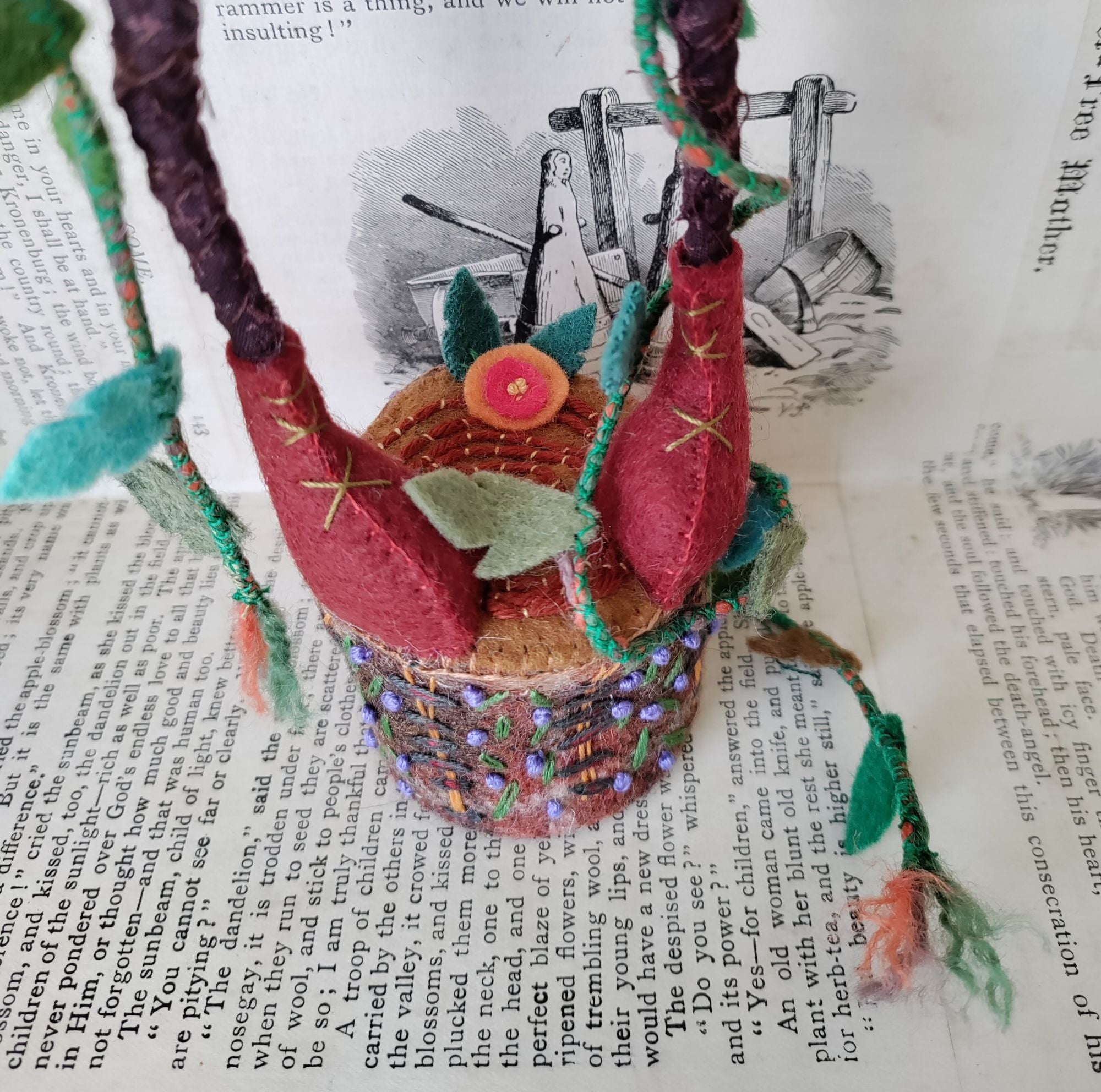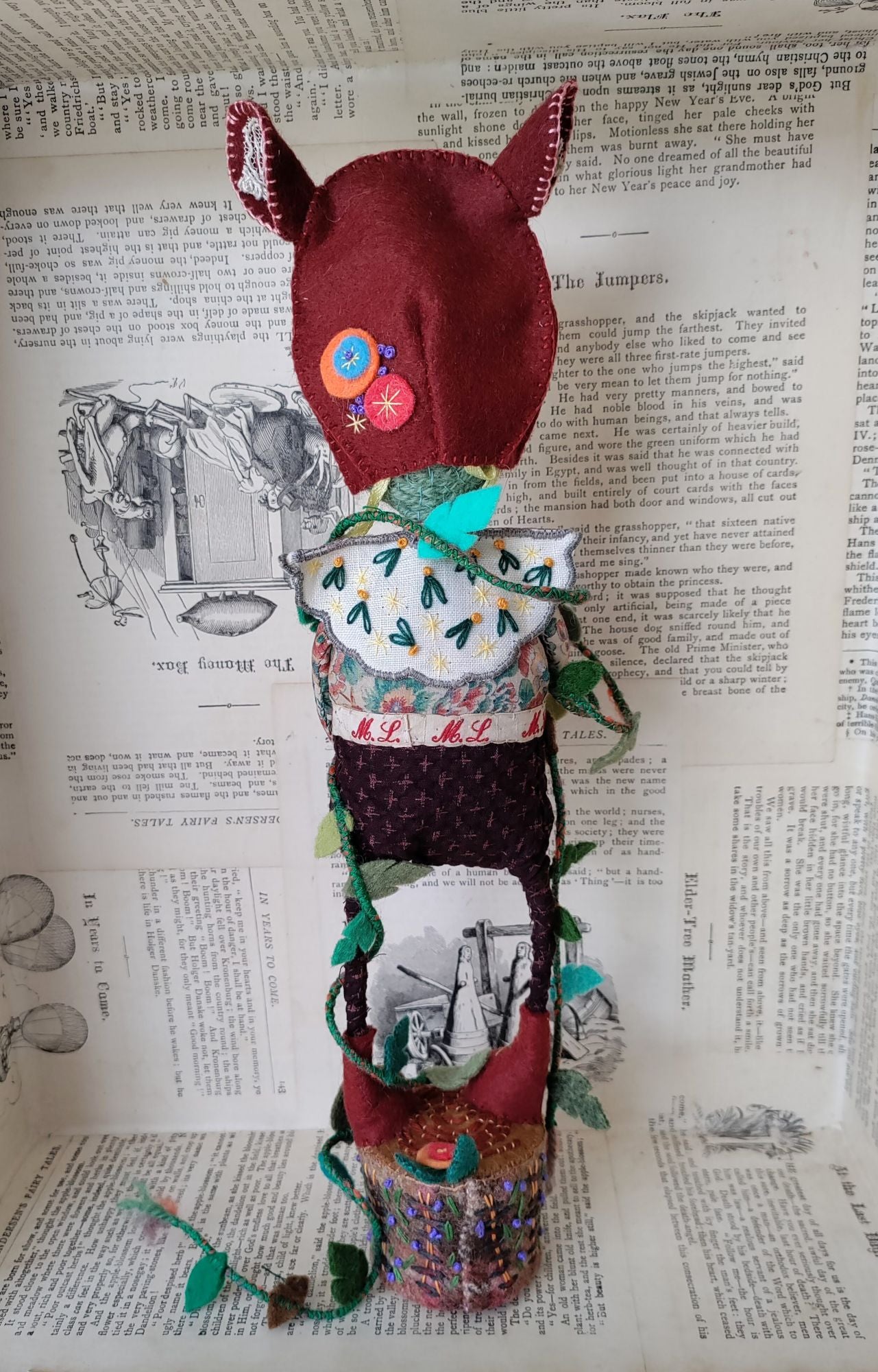 Mixed materials and found objects (cotton fabric, vintage linens, wool, wool-mix felt, wire, wooden cotton reel, acorn shell tops). Handstitched
